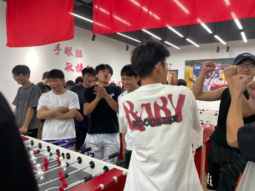 比赛现场,同学们热情高涨,积极参与。他们紧握操控杆,眼神紧盯桌面 “赛场” 上的一举一动,周围围观的同学也个个情绪激昂,有的挥舞着拳头为参赛选手呐喊助威,有的紧握双手,脸上满是紧张与期待的表情,有的则在积极防守,紧密协作,共同抵御对手的攻势。整个赛场弥漫着紧张刺激又欢乐融融的竞赛氛围,将体育竞技的活力与激情展现得淋漓尽致。